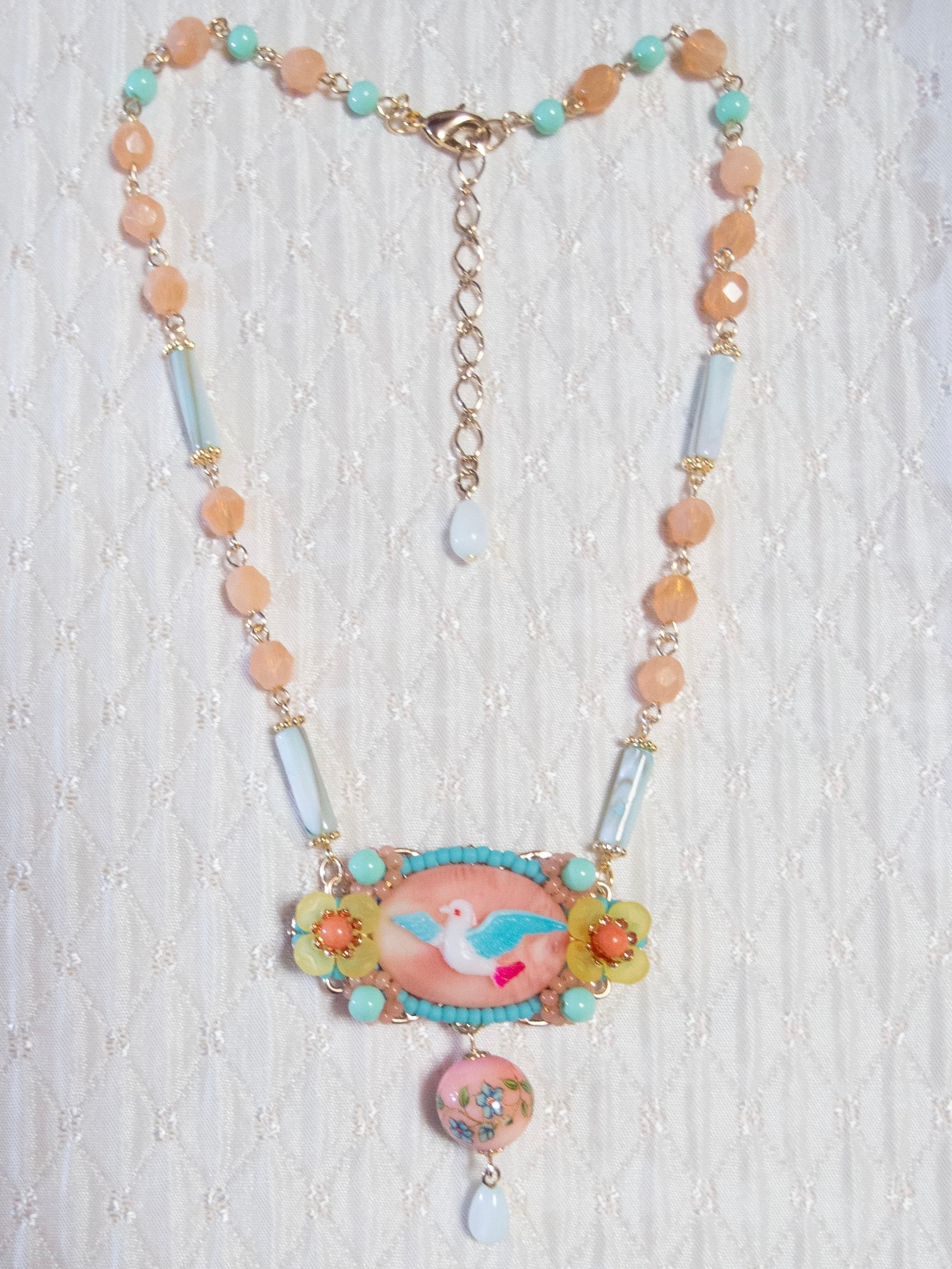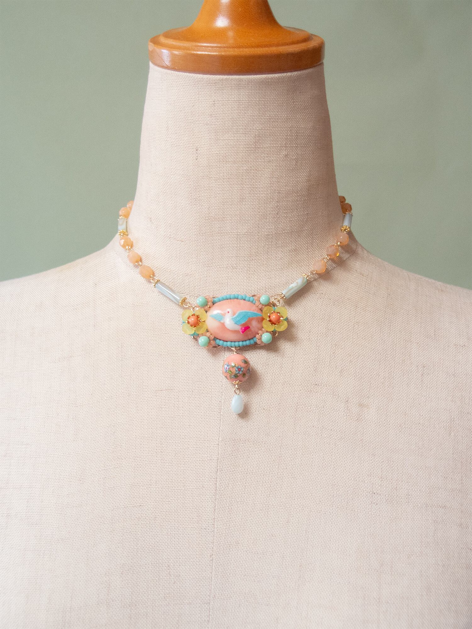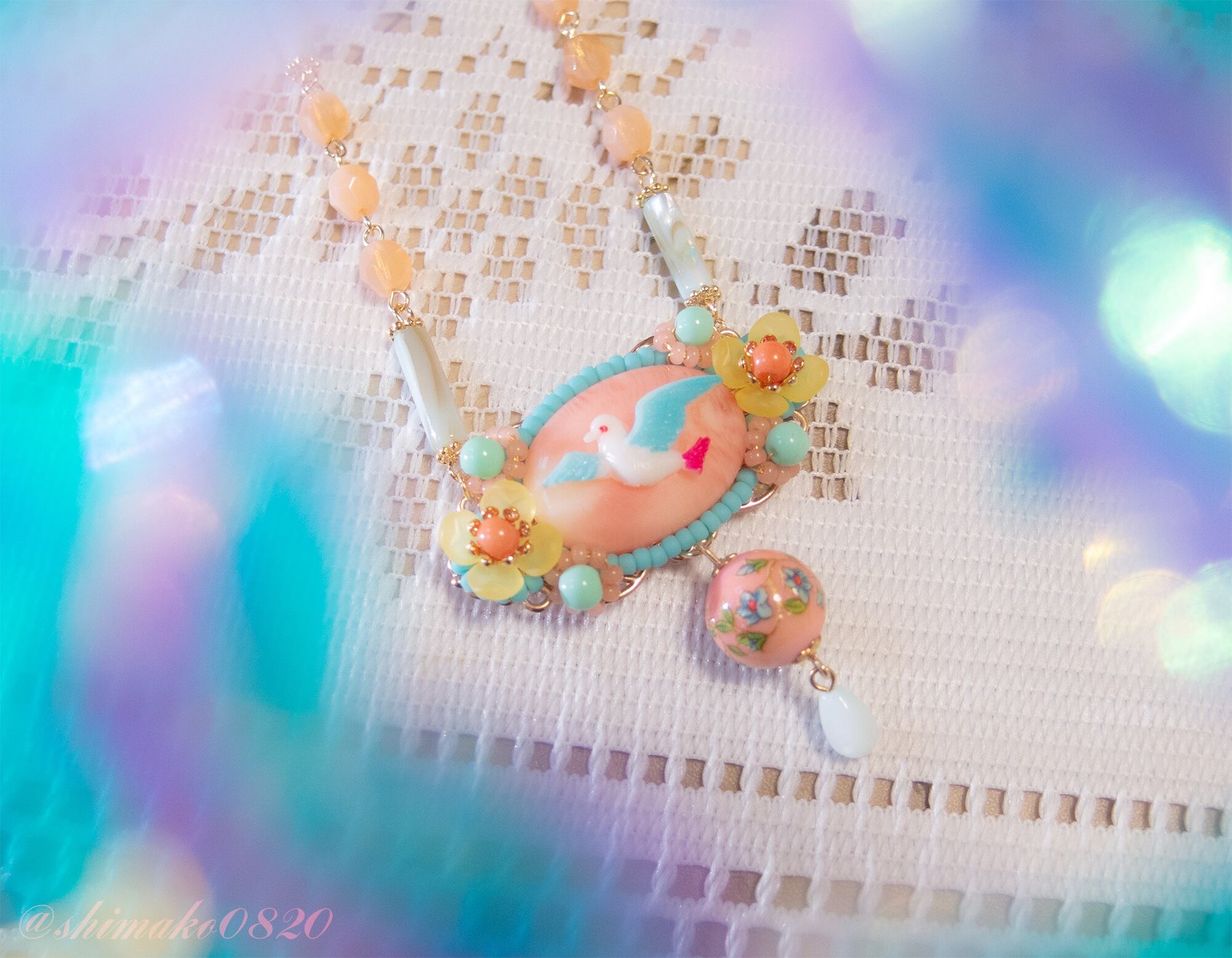 ジャパンヴィンテージの鳥のカボションを中心にしたモチーフに、水色のシェルビーズを合わせたチョーカーを仕立てました。