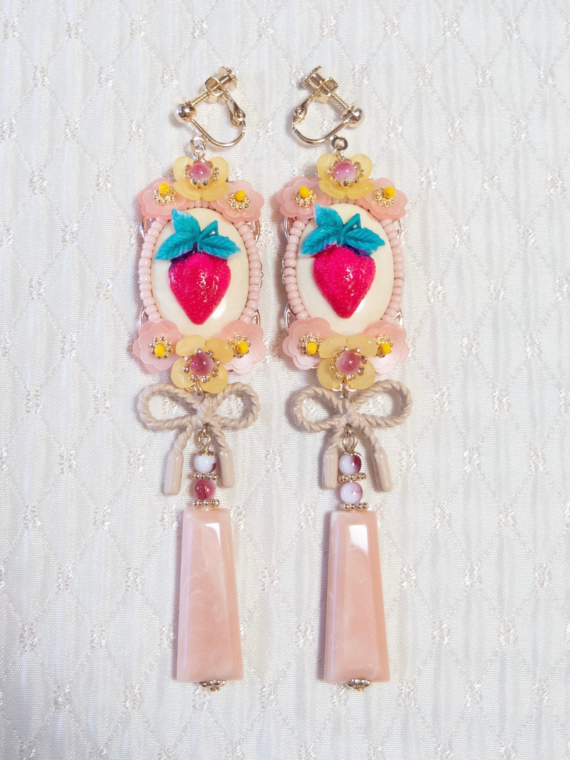 ジャパンヴィンテージの果物パーツを、アクリルやスパンコールの花で飾った大ぶりの耳飾り。